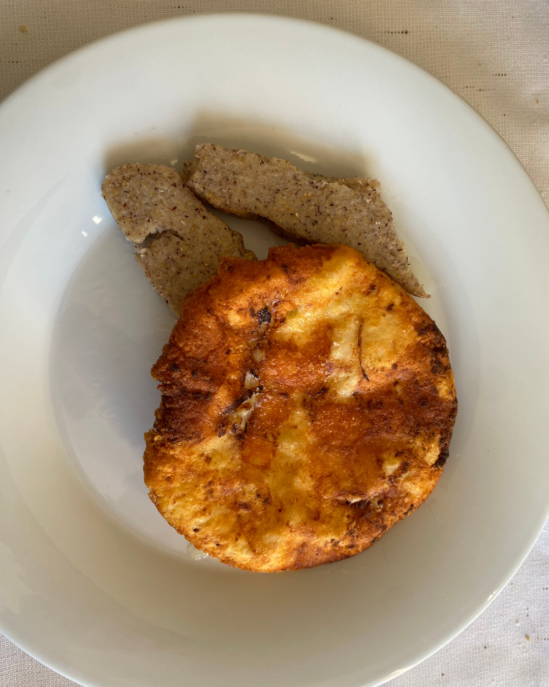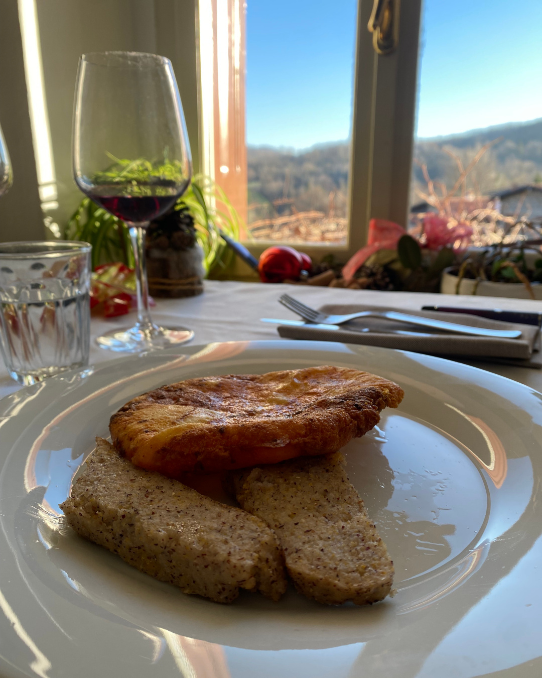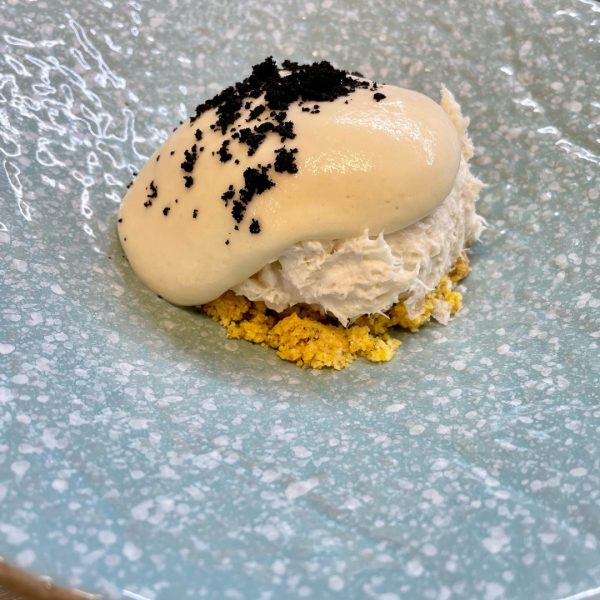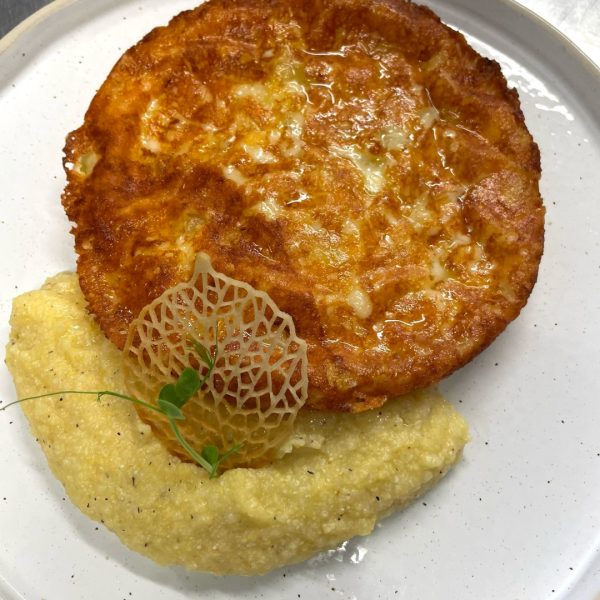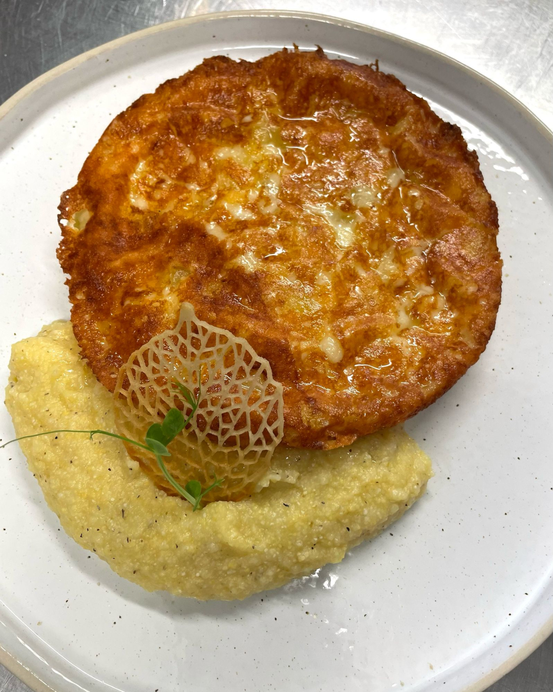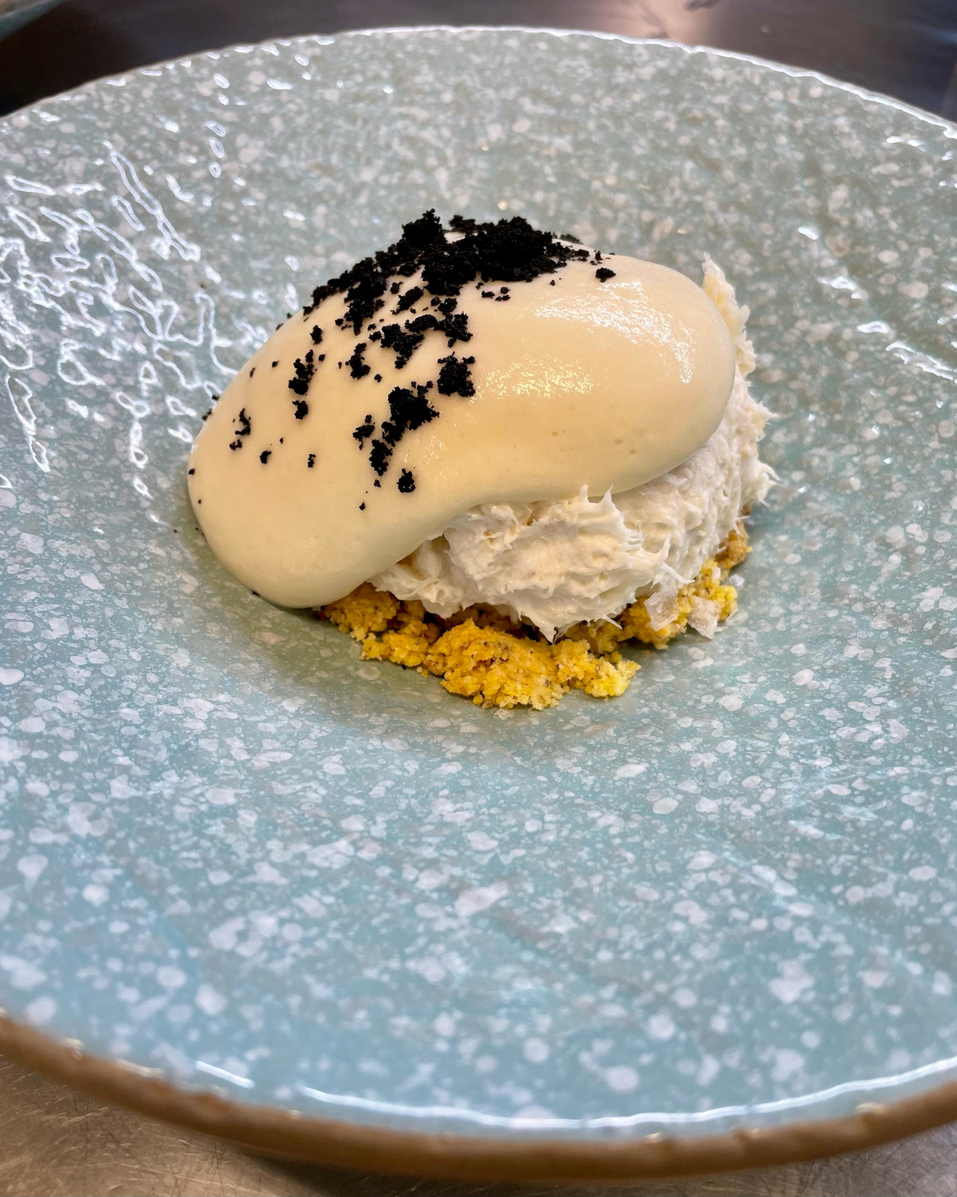- Baccalà mantecato su crumble di polenta con spuma di patate e polvere di olive nere