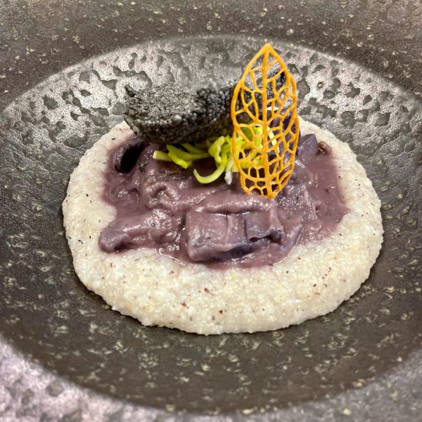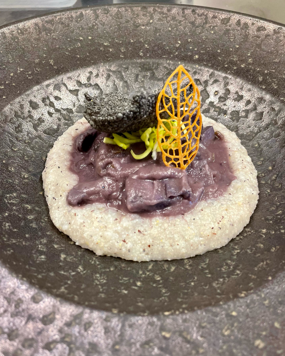 - Seppia in umido con porro e cavolo viola, polenta grigia e chips di polenta al nero