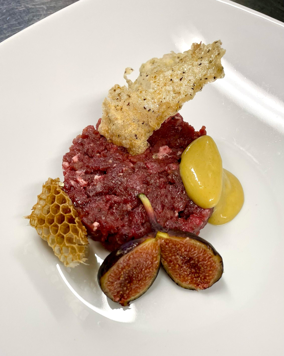 - Tartare di cervo, fichi, miele, senape e chips di polenta