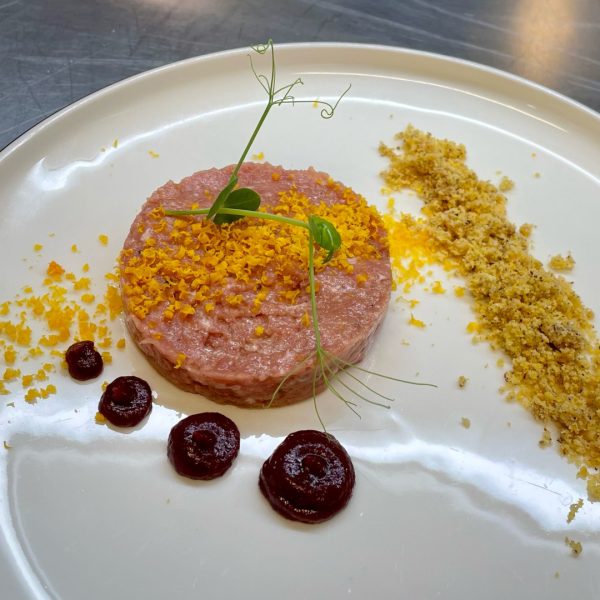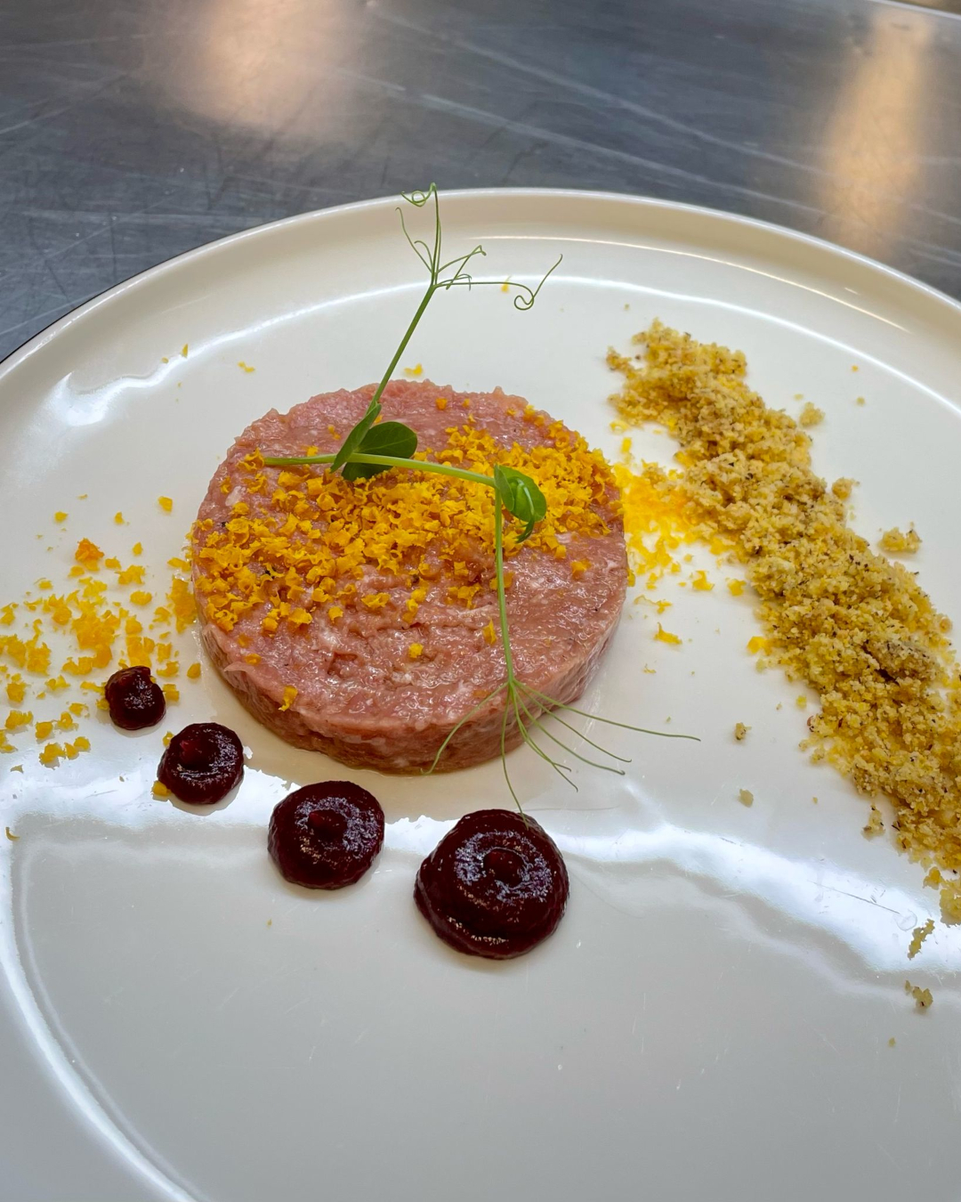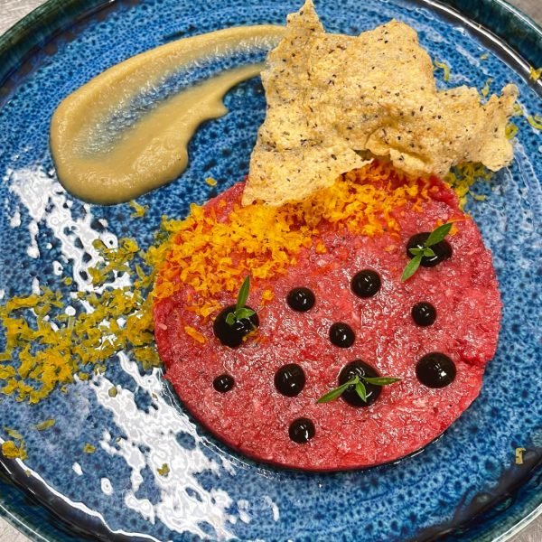 - Tartare di vitello al gin, polenta sbriciolata, gel ai frutti di bosco e tuorlo d’uovo marinato