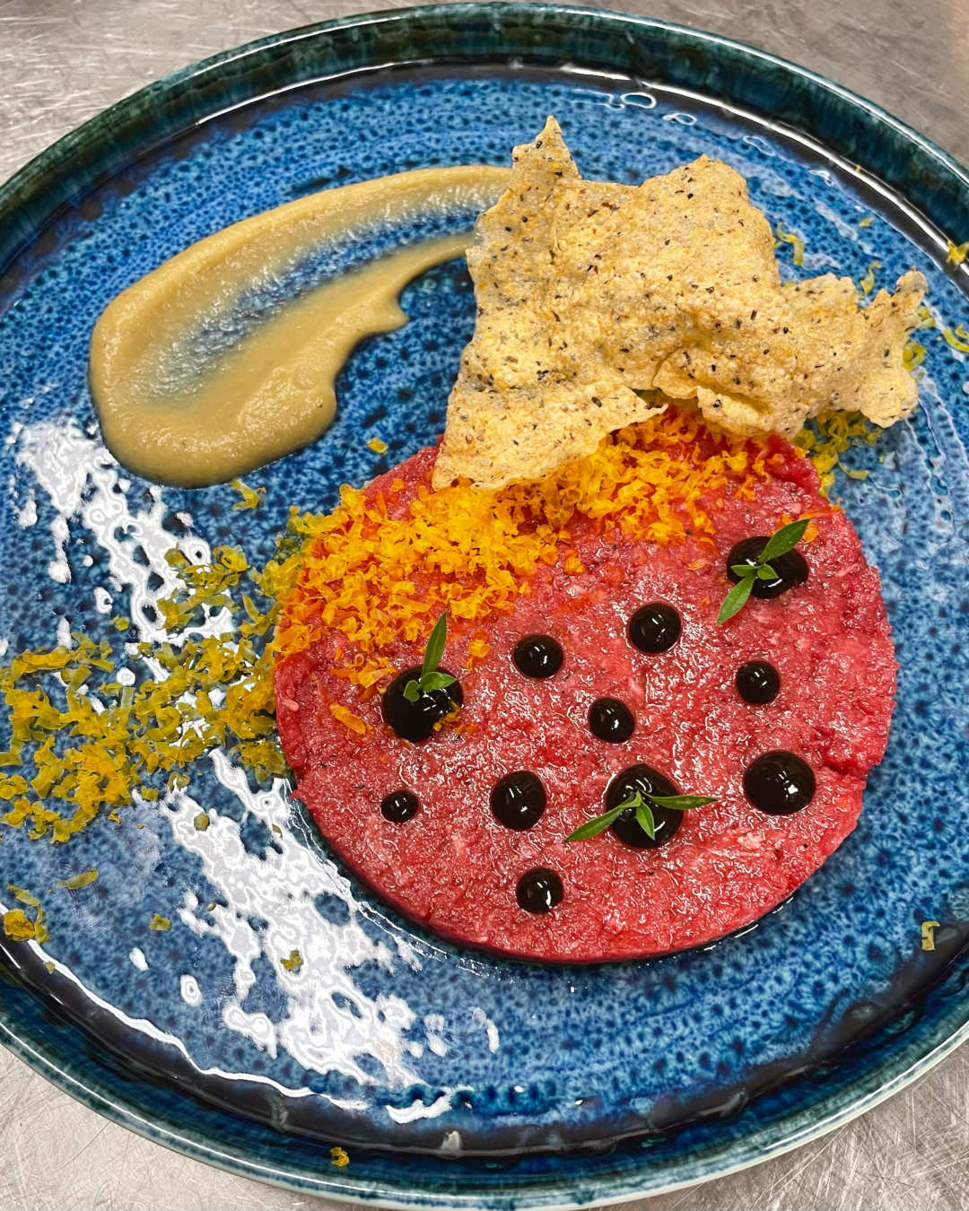 - Tartare di manzo, gocce di aglio nero, salsa ai carciofi, tuorlo d’uovo marinato e chips di polenta